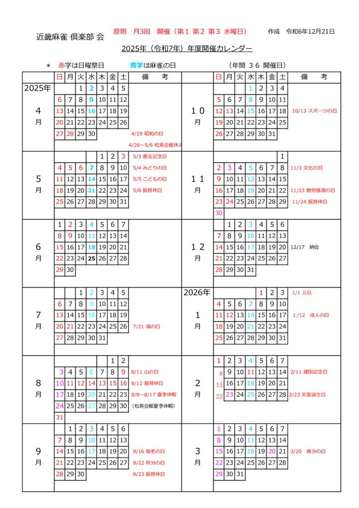 2025.03.24 近畿麻雀倶楽部 近畿麻雀倶楽部 2025年度競技日カレンダー 更新日:2025年04月02日 ♦ 麻雀俱楽部TOPページへ ♦ 投稿者: umehara 近畿麻雀倶楽部 コメント: 0