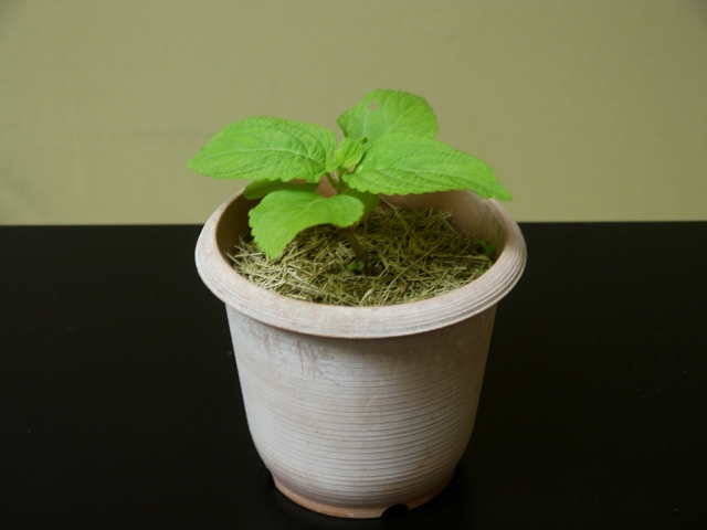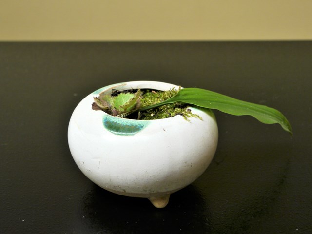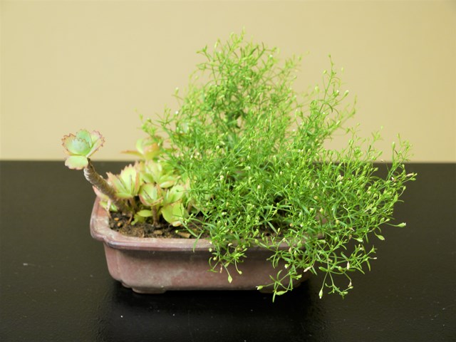 年間10回の活動の中、春と秋に小鉢物の鑑賞を目的にした相互交流研修会を行っています。自宅で育てている小鉢物を持ち寄り、各自が栽培するための育て方と品種について紹介し、出席者からの助言・質問等を含めた交流研修会で栽培技術の向上につなげています。今回は、東出さん・西川さん・樫本さんより5作品が出品されました。