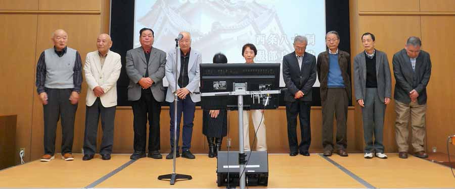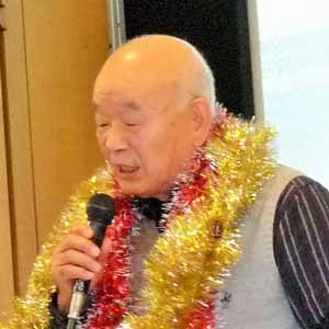 皆様、今日は元気一杯歌って頂き有難うございました。 去年よりまた皆様方のお声がレベルアップして、楽しく聴かせて頂きました。 これから記念撮影に入ります。4列で行きます。まず椅子席13名、その後ろの立ち席、檀上の立ち席、台上の立ち席でお願いします。女性は前の方へ、会長、来賓、副会長、大会委員長は椅子席中央ににお願いします。では、準備に掛かりますのでよろしくお願いします。本日は皆様方元気よく歌って頂きまして有難うございました。来年も頑張りましょう。