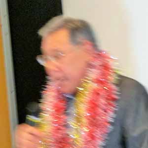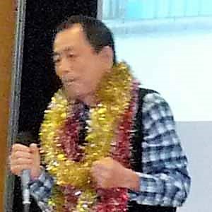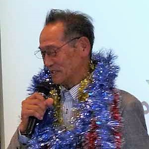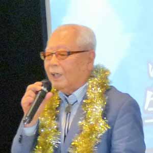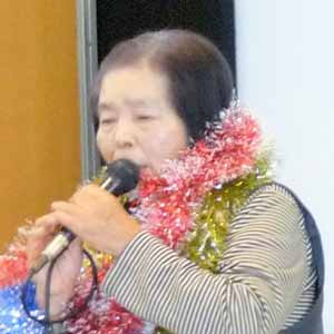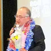 会長の上田の方からも皆様方に宜しくお伝え下さいと仰っていましたので、代弁ですがご紹介させていただきます。 一点だけ場違いになりますが、私、本部で松愛会も会社も含めてパナソニックグループ one papaという形の中で ”AKARI”アクションという取り組みを行っています。実はこういう単行本の中にISBNというバーコードが2つついています。無い物は巻末にISBN云々の文章がかいてあります。こういう本を寄贈頂きますと、ソーラーランタンに変わりまして世界の無電化地域に寄贈をするということをパナソニックグループとして行っています。6月にソーラーランタン90台をカンボジアに寄贈してまいりました。こういった事をできるだけホームページの中に載せていくので是非ともご協力をお願いしたい。カラオケに来られる時に、たとえ1冊でもいいので松愛会事務局でこれを山元に預けてくれと仰っていただいたらそれをまとめて、私たちの所に届くようにしておきます。 今、どういう風になっているかといいますと、私たちのグループから本をバリューブックスに引き取ってもらいます。そこが本を売って1マイルになるとパナソニックの基金に入れます。パナソニックはその1マイルに対して会社がプラス1マイルして合計2マイルを積み立てていきます。それらを何カ月に1回貯まったものをソーラーランタンの購入費用に充てて、それを先程もいいましたように無電化地域に寄贈していくという形です。そういうこともホームページに載せていこうと思っています。私が担当しています社会貢献としてやっていますので、是非ともご協力の程よろしくお願いします。 長くなりましたが、本日、宜しくお願いします。  午後一番に、桂銀淑の『大阪暮色』を熱唱され、後半の部の開始に勢いをつけて頂きました。