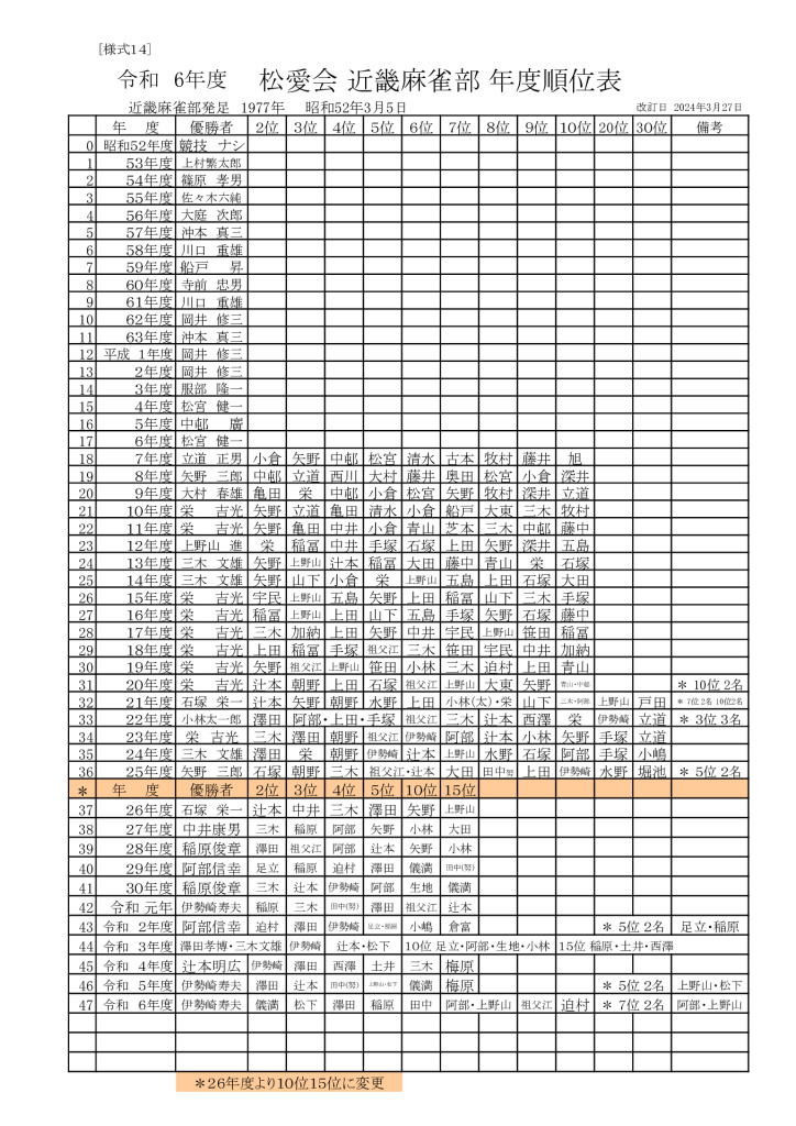 2025.04.23 近畿部会 近畿麻雀倶楽部年度別成績表 ♦ 麻雀俱楽部TOPページへ ♦ 更新日:2025年4月01日改訂 麻雀部麻雀倶楽部年度順位表 投稿者: umehara 近畿部会 コメント: 0