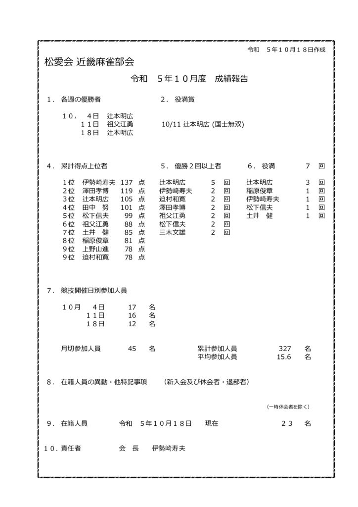 2023.12.6 近畿麻雀倶楽部 近畿麻雀俱楽部 2023年(令和5年)10月度 成績報告 投稿日:2023年10月19日 ♦ 麻雀俱楽部TOPページへ ♦ 投稿者: umehara 近畿麻雀倶楽部 コメント: 0