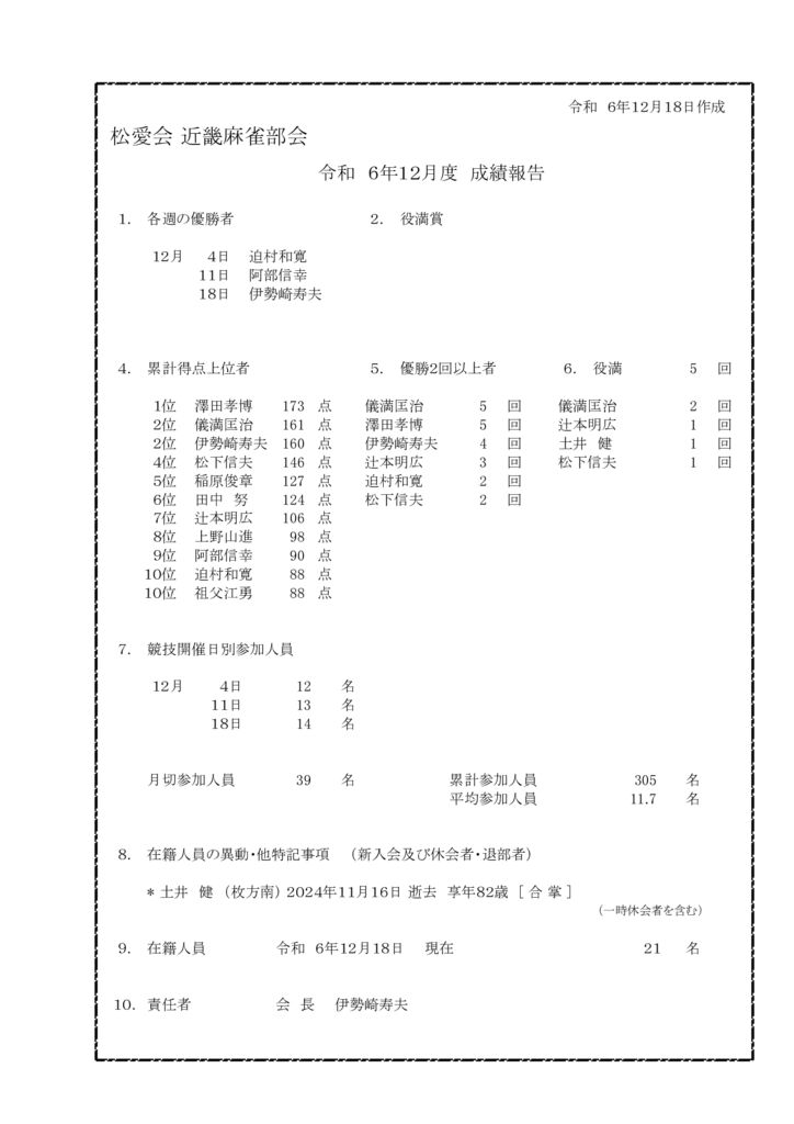 近畿麻雀俱楽部 2024年(令和6年)12月度 成績報告