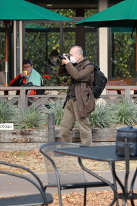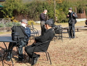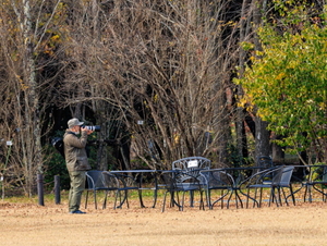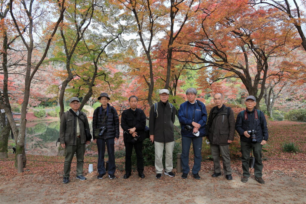 ここ関西の紅葉もいよいよ佳境を迎えた11月30日、今月度の撮影会は久しぶりの京都府立植物園です。午前10時に北山門に集合、参加者は7名です。ここは京都地下鉄北山駅を上がってすぐで交通至便のうえ、70歳以上は入場料無料というありがたい特典を部員の多くは享受していました。早速まず、もみじのきれいな「なからぎの森」の池の周辺に行って恒例の記念撮影を行います。記念撮影ということでマスクも外しています。その後池の周りのきれいな紅葉を撮影です。今日は午前中は曇り空でしたが風もなく水面にもみじの映り込みがきれいでした。その後みんな自由に撮影を続けましたが、やや早い昼食ということで三々五々園内の真ん中付近にある「森のカフェ」で取りました。だんだん天気も良くなって最初は寒いと思っていたのに暑いくらいの気温になり、食後しばらくその前の芝生を敷き詰めた憩いの広場「大芝生地」でのんびりと休憩していました。