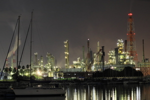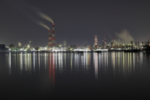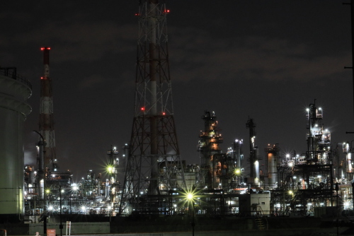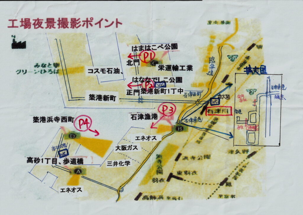 年もいよいよ押し詰まってきた師走12月21日、今年最後の撮影会は、たぶん当写真部としては初めての工場夜景撮影です。午後4時45分に南海石津川駅に集合、参加者はゲスト1名計7名です。堺観光コンベンション協会が主催する工場夜景タクシーというのがあって今回は最大9名まで乗車できるジャンボタクシーを予約しています。その運転手さんにもらった撮影ポイントの説明図を参考に下に表示しておきますが、堺臨海工場地帯を主に4ヶ所まわります。駅前からタクシーで午後5時頃に出発し、築港新町の”はまはこべ公園”というところでまだ明るいうちに記念撮影をしてコスモ石油工場を横から写し、次は同じコスモ石油の周囲を回りながら良いポイントで撮っていきます。運転手さんは臨機応変によさそうな所を案内してくれています。そのあと石津漁港へ行きましたが、ここは関係者以外立ち入り禁止のようですがあらかじめタクシーの方で許可を取ってくれていました。さすがにあたりは真っ暗になってきました。港に泊まっている船越しにエネオスの工場が見え、照明光が海面に映ってきれいです。いよいよ最後のポイントへ向かいます。ここは海に突き出た形のところの海岸沿いで中海を挟んで対岸のエネオス、大阪ガス、三井化学といった工場群がきれいに並んで見え、工場の照明が海面に映って大変きれいです。一応撮影ポイントはここで最後でしたが、サービスということで泉大津のフェリーターミナル近くまで工場地帯をドライブし、帰りはそこから阪神高速湾岸線に乗り高架道路上から工場地帯を眺めて石津川駅まで帰りました。2時間半ほどでしたが、なかなか盛沢山な撮影でした。