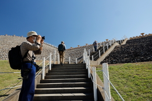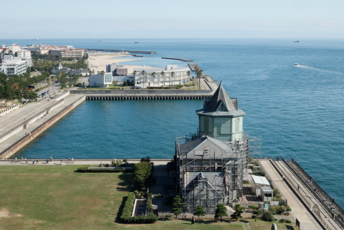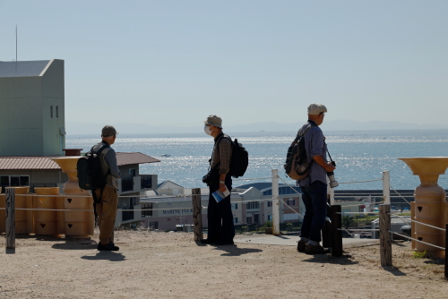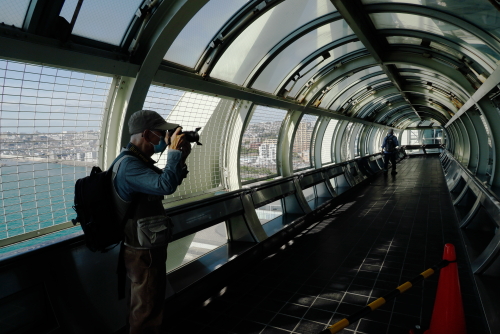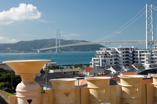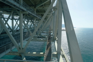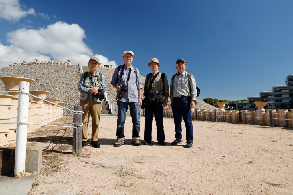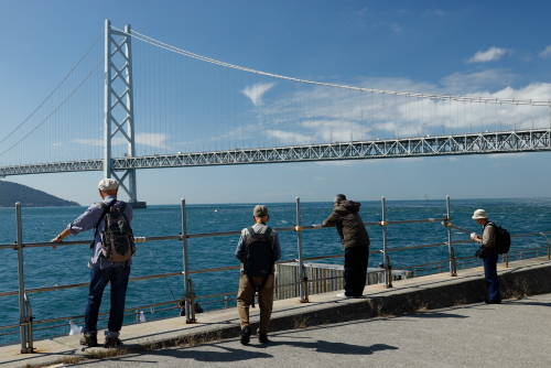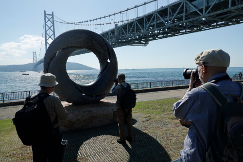 10月に入り、ようやく朝晩は涼しく感じられるようになった14日(金)延び延びになっていた10月度撮影会は五色塚古墳と舞子公園です。もともとは9月の計画だったのですが写真展が9月下旬となったため撮影会は10月にずらし、当初7日の予定が当日かなりの雨天の予報が出たため今日に延期されたものです。朝から好天の撮影日和ではあったのですが、なぜかやたらと暑い日でしたね。JR垂水駅に午前10時集合、参加者は少し寂しい4名でした。駅から徒歩で五色塚古墳に向かいます。この五色塚古墳は4~5世紀の古墳時代中期に築造されたものと言われており、昭和40年代に元の姿に復元された前方後円墳で、今でも築造当時の姿にきちんと整備されており墳頂からの眺めはなかなかのものです。平日ですが撮影中も地元の方と思われる散歩の人や見学者が次々と訪れて意外と人気があるのだなあと思いました。ここで1時間ほど過ごし、また徒歩で舞子公園に向かいます。舞子の浜は明石海峡大橋のすぐそばで、大変気持ちの良い浜辺で海面はきらきらと光り、また釣り人もたくさんいました。ここでしばらく明石大橋などを撮ってからちょうど昼時になったので公園内にあるホテルのレストランで少々豪華にフルコースのイタリア料理の昼食です。ゆっくり食事を楽しんだのち明石大橋の橋桁の中に設けられた遊歩道である舞子海上プロムナードに行ってみました。エレベーターで海面上47mにある遊歩道?まで上がります。なかなか良い眺めの上、橋桁のすごい構造物が目を引きます。