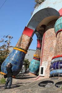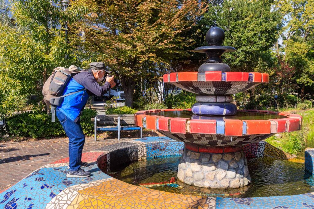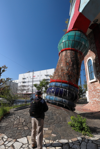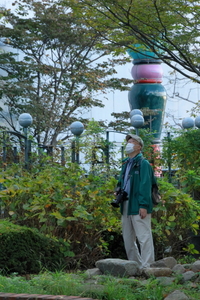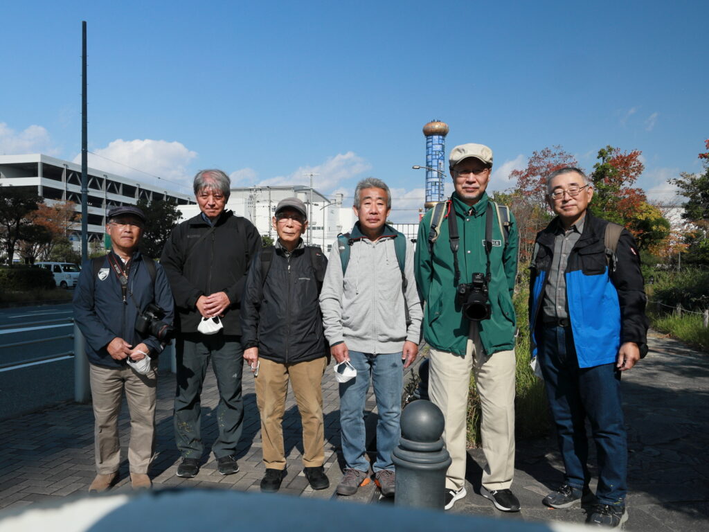 今年の後半期は恒例の秋の写真展が9月だったので撮影会は10月からスタートとなった影響で毎月開催のスケジュールでこなしています。10月の五色塚古墳に続き11月は「世界で一番美しいごみ処理場」と言われている舞洲工場と近くの北港マリーナです。11月16日(水)午前9時50分JR桜島駅集合、参加者はゲスト1名含め計6名です。桜島駅前から10時2分発のバスで「環境施設前」舞洲工場の前に行きます。レポーターは舞洲へは何度も行きましたがこの舞洲工場の前は通るばかりでじっくり見学したことはありませんでした。工場内を見学するにはあらかじめの申し込みが必要ですが、外観を撮影するだけなら周りの庭や3階の屋上庭園まで自由に入れます。世界的な建築デザイナーのフンデルトバッサー氏がデザインしたこの建物をあらためて近くで見るとなんと表現すればよいのでしょうか、そのスケールのでかさと異様さに圧倒されますね。ここで昼前まで自由に撮影し、その後昼食に移動です。幹事さんが近くに見つけてくれておいた、コンビニが入っている建物の2階にある舞洲食堂に入りました。ここは近くで仕事をしている人々が来る食堂のようで社員食堂のような感じですが、なんとボリューム満点のメニューがなんでも500円均一なのです。みんな満腹になったところで次はすぐ近くの舞洲工場と兄弟みたいな建物の舞洲スラッジセンター(下水汚泥処理場)の撮影です。ここも舞洲工場と同じデザイナーによるものですが、こちらの方が少し落ち着いた感じですかね。前庭にはなぜかザクロの木がたくさん植わっていて実がたわわでした。