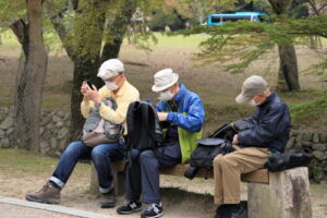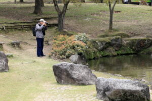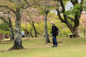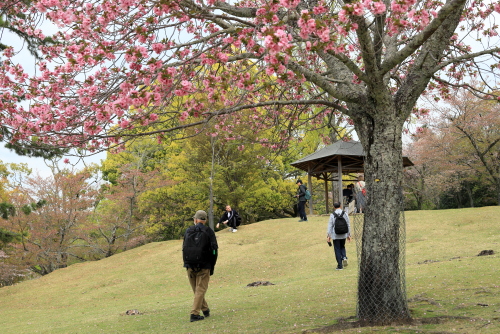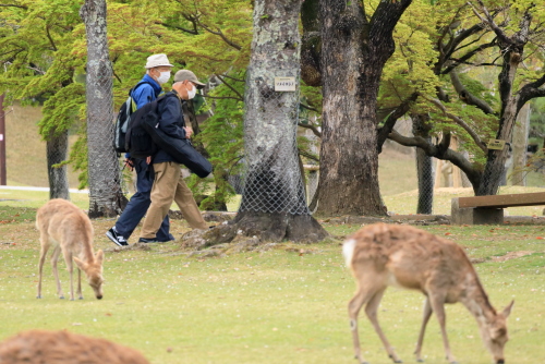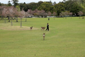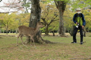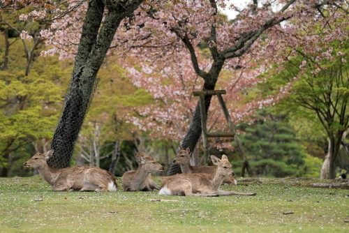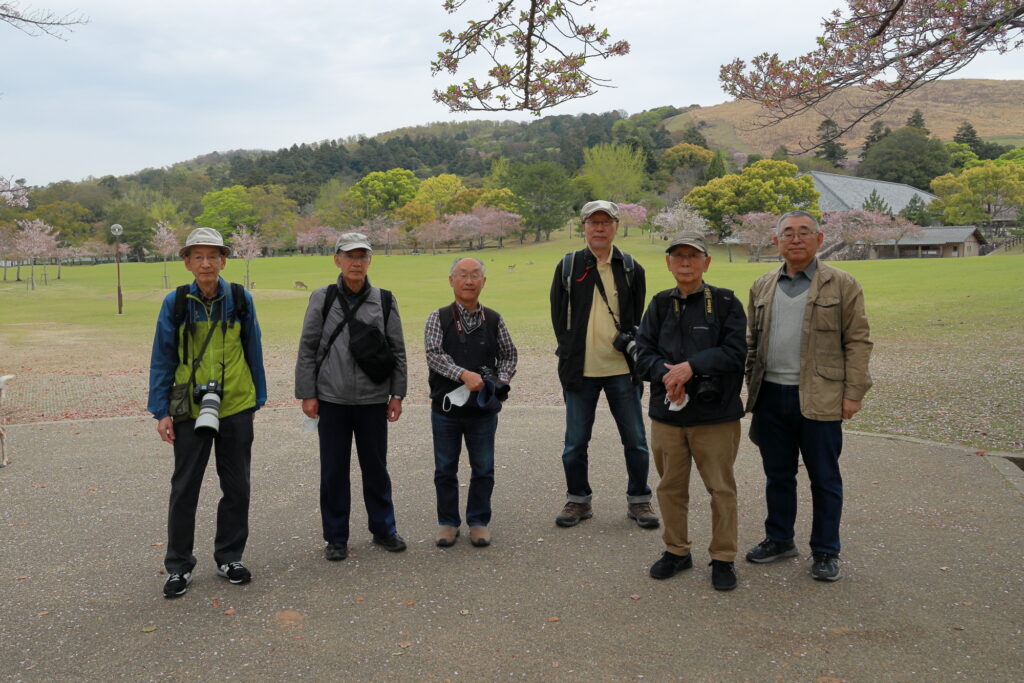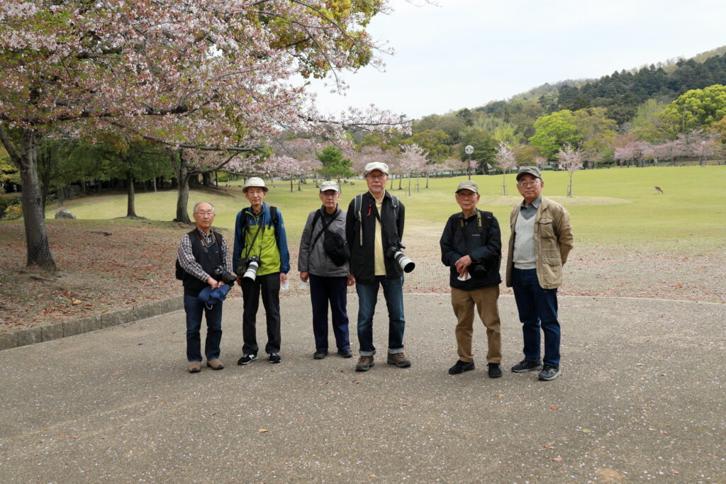 今年は暖冬のためか桜の開花が全国的に早くて関西ではほとんどの桜は入学式には間に合わなかったようです。当写真部の4月度撮影会も奈良公園の桜吹雪と鹿を狙っていましたが、予定日の4月5日はすでにほとんどの桜が散ってしまい吹雪も止んでいました。当日は曇り空でしたが時々日が差す寒くも暑くもない誠に撮影日和した。午前10時に近鉄奈良駅の行基像前に集合、ゲスト1名計6名の参加でした。まずバスで奈良公園の入り口まで移動し、公園内の春日野園地へ向かいます。春日野園地は周囲が桜の木に囲まれたやたらと広い感じの広場ですが、周囲の桜の下には鹿たちがのんびりとたたずんでいて、これが満開の桜と地面が桜の花びらに覆われておればさながら桃源郷のような風景が見られたのですが…多くのソメイヨシノはほとんど散ってしまっていて地面もはらはらと花びら散っている程度でした。ちょっと時期が数日遅かったようですね。幸いというか観光客もそれほど混雑していなくて撮影はゆっくりできましたが。ソメイヨシノはほとんど散っていましたがナラココノエザクラなどのボタン桜系や枝垂れ系はきれいに満開で、結婚式の前撮りでしょうか、花嫁衣裳のカップルが桜の下でカメラマンにポーズをとっている景色も見られました。