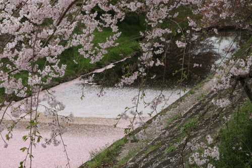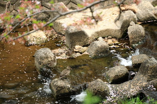 近くのレストランで昼食後自由解散となりましたが、多くのメンバーは近くの佐保川の桜へ向かいました。ここは佐保川の両岸に桜並木が続いていて花が散ればきっとすごい花筏になるだろうと思いますが、こちらもピークを過ぎてだいぶ花が少なくなっていてところどころで花筏が見られたのですが。佐保川にそってずっと歩いて奈良駅から一つ手前の近鉄新大宮駅で終了です。