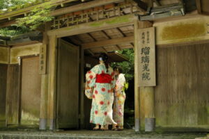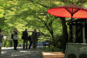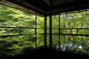 梅雨の時期に入って各地の集中豪雨による被害も心配なほどですが、今月の撮影会はその梅雨の最中の7月7日(金)七夕の日です。当初三千院のアジサイも予定していたのですが、瑠璃光院の特別拝観が7月からだったのでこの日になりました。午前10時に叡山電鉄出町柳駅集合で、参加者はゲスト1名合計6名です。幸いにして梅雨の晴れ間ですが天気予報では京都は最高温度35度以上という暑くなりそうな気配です。叡山電鉄の終点八瀬比叡山口駅から徒歩で瑠璃光院に向かいます。時間が早かったせいか待ち時間もなくスムーズに入場出来ましたが、拝観料が2000円と少々高めですね。お目当ては書院2階に置かれた広い写経机の天板に外の庭の青もみじがきれいに映っていてなかなかの景観です。庭そのものも苔庭で落ち着いた佇まいはなかなかのものです。その後数人が瑠璃光院のすぐ隣のルイ・イカール美術館に立ち寄りました。ここはフランスの画家の作品がサロン風の5つの展示スペースにそれぞれ趣向を凝らして展示されており、特に撮影するものもありませんがちょっとした居心地の良い美術館です。