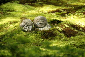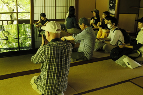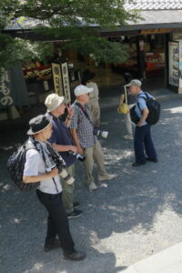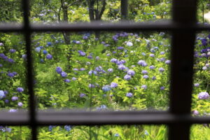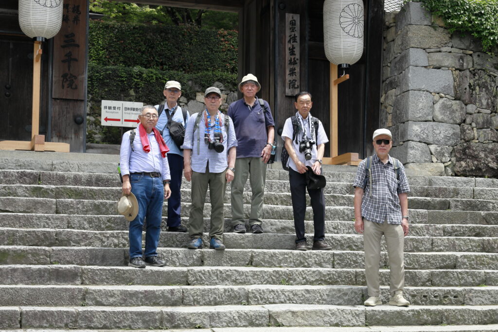 その後みんなでバスに乗り三千院に向かいます。三千院はバス停からちょっとした上り坂を歩いていきます。門前でちょうどお昼時となったので皆で昼食をとってから拝観します。ここは最初に客殿、宸殿などに上がり、そこから有静園という庭園に出ます。おなじみのわらべ地蔵は以前に来た時に比べるとだいぶ苔に覆われていましたね。この上にあるあじさい園では、ほとんどが丸い西洋アジサイでガクアジサイは少なかったですね。もう7月に入っていてピークは過ぎていると思いますがまだまだ花はきれいでした。帰りはここを出てからバスで直接京阪出町柳駅まで乗ってから解散となりました。