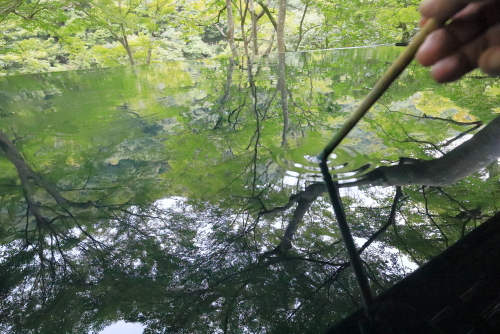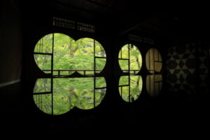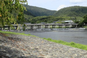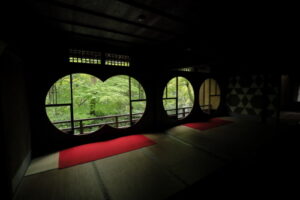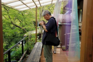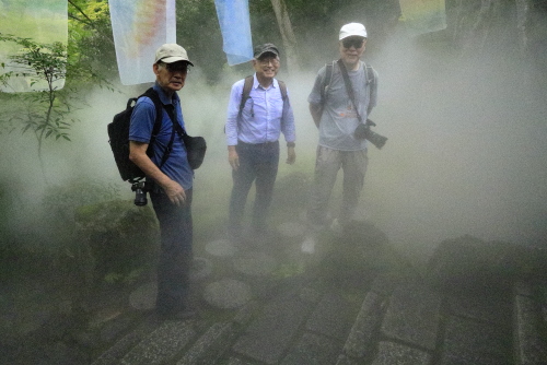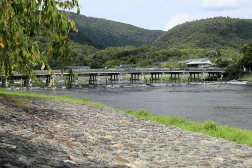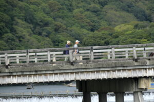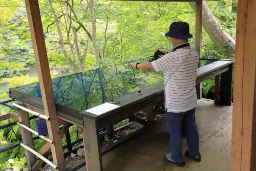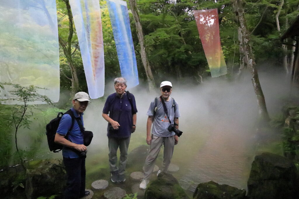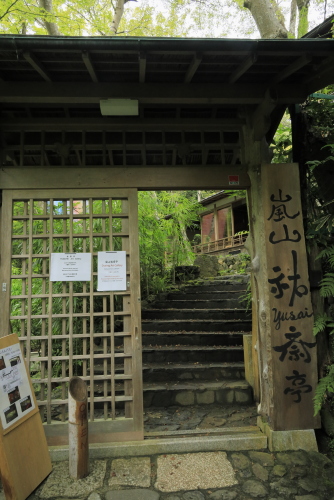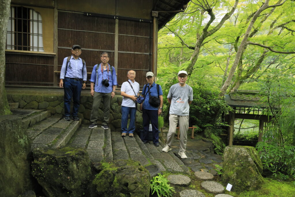 9月に入ってようやく朝晩は少し過ごしやすくなった11日(月)、9月度撮影会は京都嵐山の祐斎亭です。あいにく撮影幹事さんが体調不良で欠席となりましたが、参加者はゲスト2名計6名です。当日10時に阪急嵐山駅に集合、歩いて祐斎亭に向かいます。渡月橋を渡って桂川沿いに少し行ったところにあります。長い石の階段を上がると小さな門があって庭を抜けて玄関があります。入場料2000円を払って上がると庭に面して和室がありその窓が丸やハート形になっていて外の緑の木々が見えます。部屋の中には表面がガラス状の面になった大きなテーブルがありその表面に写った窓越しの景色がなかなかきれいです。テーブルの表面に写る庭の景色を見るのは7月に行った瑠璃光苑と同じですがこちらはテーブルの表面がガラス状でしかも窓の形がユニークなため写真に撮ると大変面白い絵になりますね。ここの2階は染物の工房になっていてきれいな染め物も見ることが出来ますし、2階のベランダからは桂川をゆく屋形船なども見られます。一通り撮影を終わって玄関先で記念写真を撮り、外へ出ると天気予報では午後からだった雨が降り出したので傘を差しながら天龍寺の前まで歩き、食堂で昼食です。祐斎亭のあたりはそんなに人も多くなかったのですが、さすがに天龍寺あたりのメインストリートは結構な人込みですね。半分くらいはインバウンドでしょうか。