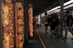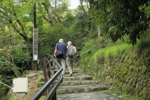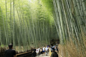 昼食後解散となりましたが、半分くらいのメンバーはそこからすぐの竹林の小径に行きました。「嵐山竹林の小径」から「嵯峨野竹林の小径」とぐるっと回りまた天龍寺のところに帰ってきます。ここも手前側の嵐山竹林の小径はまるでラッシュアワーのような人混みでしたね。線路の向こう側の竹林は少し人が少なかったのですが。この後嵐電の嵐山駅中で休憩しましたがそのころまた雨が激しくなって、結局阪急嵐山駅までずっと雨の中でした。