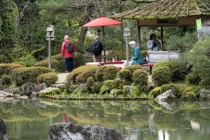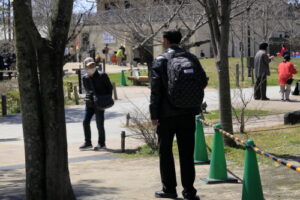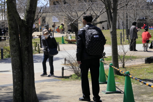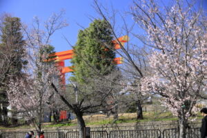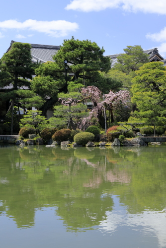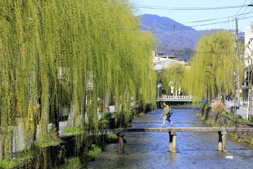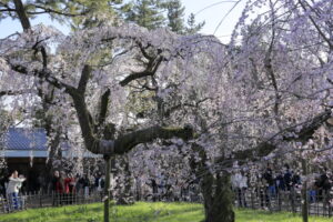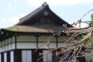 【番外編】レポーターの筆者はこの後白川の柳をみて京都御所と京都御苑をまわり、近衛邸跡の枝垂桜でほぼ満開の桜に巡りあいましたのでご参考に簡単にレポートします。白川の柳並木はちょうど薄緑に芽吹いていて、春の太陽にきらきら反射する川面に映えて、また川にかかる一本橋は行者橋とか阿闍梨(あじゃり)橋とか呼ばれるそうですが誠に絵になる風景です。京都御所は近年通年見学ができるようになりましたが入り口の清所門には長い行列ができていて荷物検査を受けて番号札を首にかけて入場します。さすが国有の施設なので入場無料です!(^^)v。中心の建物の紫宸殿を囲む回廊の朱色も近年塗り替えられたそうで雲一つない青空に映えて大変きれいでした。ここの桜もあいにくまだ蕾でしたがスタッフの方が例年ならもうとっくに咲いているんですが…ここの隣の近衛邸跡の枝垂桜はもう咲いていますよ、と教えてくれました。京都御苑の北端にある近衛邸跡の枝垂桜は有名で私も何度か訪れたことがあります。さすがにここの桜はもう5~7分咲きといったほぼ満開に近くあたりは観光客で埋め尽くされていました。私も結局ここで夕方まで粘ってしまいました。