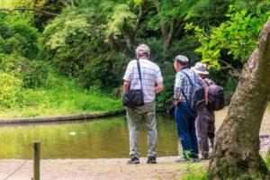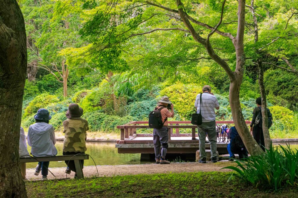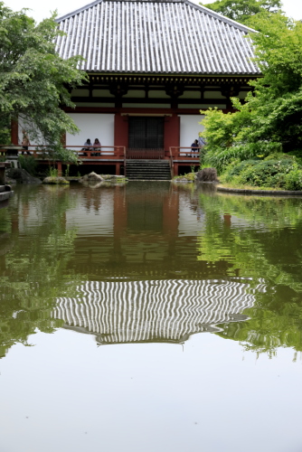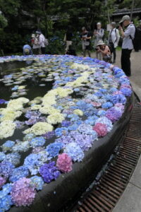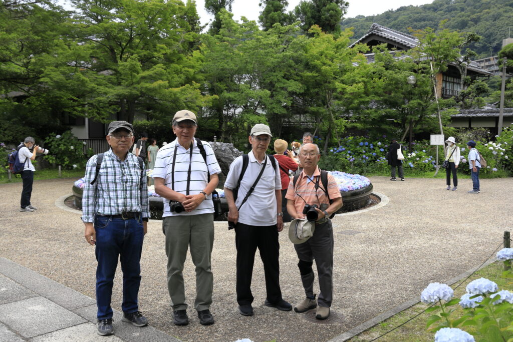 というわけで6月20日(木)の午前10時に阪急池田駅に集合。急な日程変更のためか参加者はやや寂しくゲスト1名計5名です。ここからバスで久安寺に向かいます。久安寺は開創から1300年を迎える北摂の古刹で、関西花の寺にもなっている大きなお寺です。バスから降りてすぐの拝観受付の前庭に話題の「あじさいうかべ」の具足池があり、いわゆる映えスポットというかたくさんの人に囲まれていました。早速この前で記念撮影してから拝観受付に向かいます。境内のアジサイの花はちょうど見ごろ時分で大変いい雰囲気です。本堂や御影堂、薬師堂などの周りにいろいろな種類のアジサイが咲きほこっています。またバン字池の鯉や朱雀池のスイレンなどもいい撮影対象だと思いました。昼頃になってとりあえず解散となり、一部は境内のベンチで持ってきた弁当を広げましたが、一部のメンバーは隣のそば処「かやの木」に向かいました。当初は全員ここで昼食とする予定でしたが混んでいそうなため弁当持参としたのですが、「かやの木」にトライしたメンバーは15分待ち程度でありつけたそうです。ここの蕎麦も食べたかったです(^^;)。昼食後弁当組は13時半ごろまで境内で撮影してからバスで池田駅に帰りました。