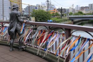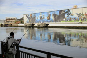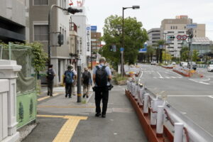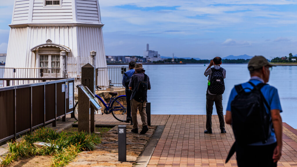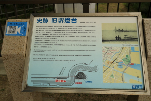 とはいえ我々撮影隊はそんなことくらいでは撮影中止にはなりません! こうなれば歩いて環濠を巡るしかないので、堺駅前の乗船場所から堺旧港、旧堺灯台へ歩きました。肝心の雨の方は出発前の10時半ころパラパラと降っただけでその後一日中良い天気でした。ホンマにこの雨の予報が恨めしかったです。