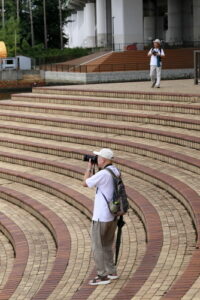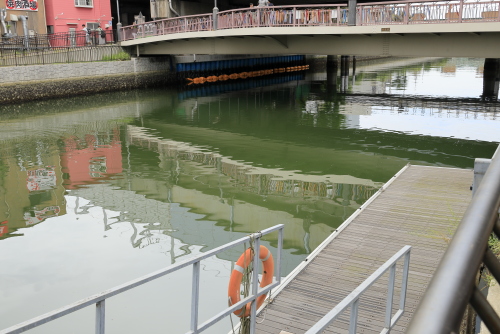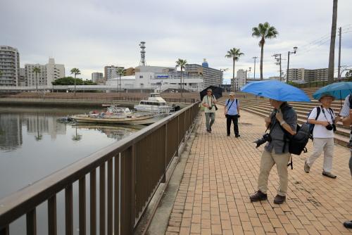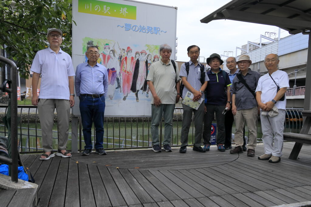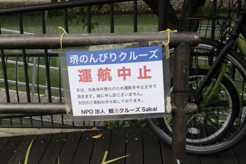 今年の夏は猛暑が続き、9月に入っても連日35℃近くの残暑が続いています。そんな中、少しでも涼しく感じたい撮影会企画として、戦国時代に堺の豪商が町を守るために掘った環濠を船で巡る「さかい観濠クルーズ」を企画しました。これは毎年春と秋の土・日曜日に運行されているもので20人ほどの小さな観光船で堺の環濠をめぐるものです。秋の運航の最初の便9月15日11時発を予約しておいて、当日10時半に乗船所のある南海本線堺駅に集合です。参加者はゲスト1名計8名です。ところが台風13号が南の方に逸れてくれたものの、その影響か雨天予報が出ていたために急遽本日のクルーズ運航が中止となってしまいました。(T_T)
