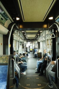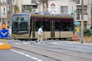一部の人はここからバスで堺駅に向かいましたが、何人かは目の前の阪堺電車で天王寺に向かいました。たまたま来た電車が最新型の堺トラムと呼ばれる超低床式車でこのタイプは阪堺電車には現在4編成しか走っていないそうです。阪堺電車は戦前からの木製車両のレトロなタイプからこの最新型の超低床式車までバラエティに富んだ構成の路面電車なので見学していても飽きませんね。少し脱線しますが11年前2013年に当写真部で阪堺電車我孫子道車庫の撮影会をしたときのレポートがありますので興味ある方は見てみてください。<https://old.shoai.ne.jp/bukai/photo/Satueikai2013_12.html>