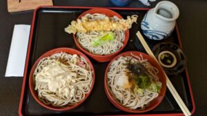 昼食は、創業300年以上の歴史を誇る蕎麦屋『手打ち蕎麦 鶴㐂(つるき)』で『近江結味蕎麦』を頂きました。『手打ち蕎麦 鶴㐂(つるき)』は、比叡山で断食の行を終えた修行僧たちが、弱った胃を慣らす為に、まず食したのが消化の良い蕎麦だと言われ、僧侶達の食事所として栄えてきたそうです。