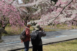 昼食後は、約30分程道に迷いながら登り坂を西教寺に向かいました。約200本の桜が境内を華やかに彩り、総門から長く続く参道はまるで桜のトンネルです。境内から琵琶湖が望め、多くの『かざくるま』が配置されており『桜とかざくるま』のコラボレーションが見事でした。観光客も少なくのんびりと撮影を楽しむ事が出来ました。帰りはさすがに疲れ、西教寺前のバス停から循環バスに乗り京阪電車の坂本比叡山口に戻り解散しました。企画してくれた幹事さんご苦労様でした。参加された皆さんお疲れさまでした。