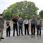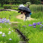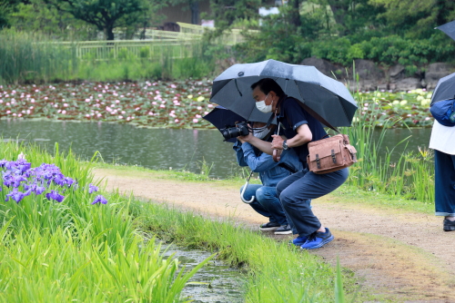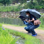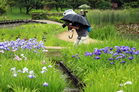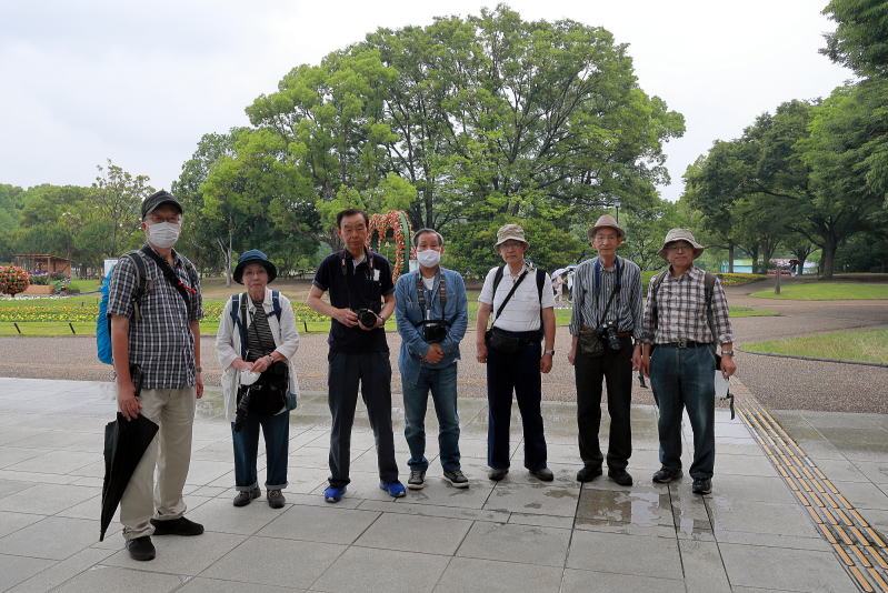あいにくの雨天にかかわらず7名が参加、まずは園内正面の大屋根の下で記念撮影を行い、アジサイの前に花しょうぶの撮影に向かいました。