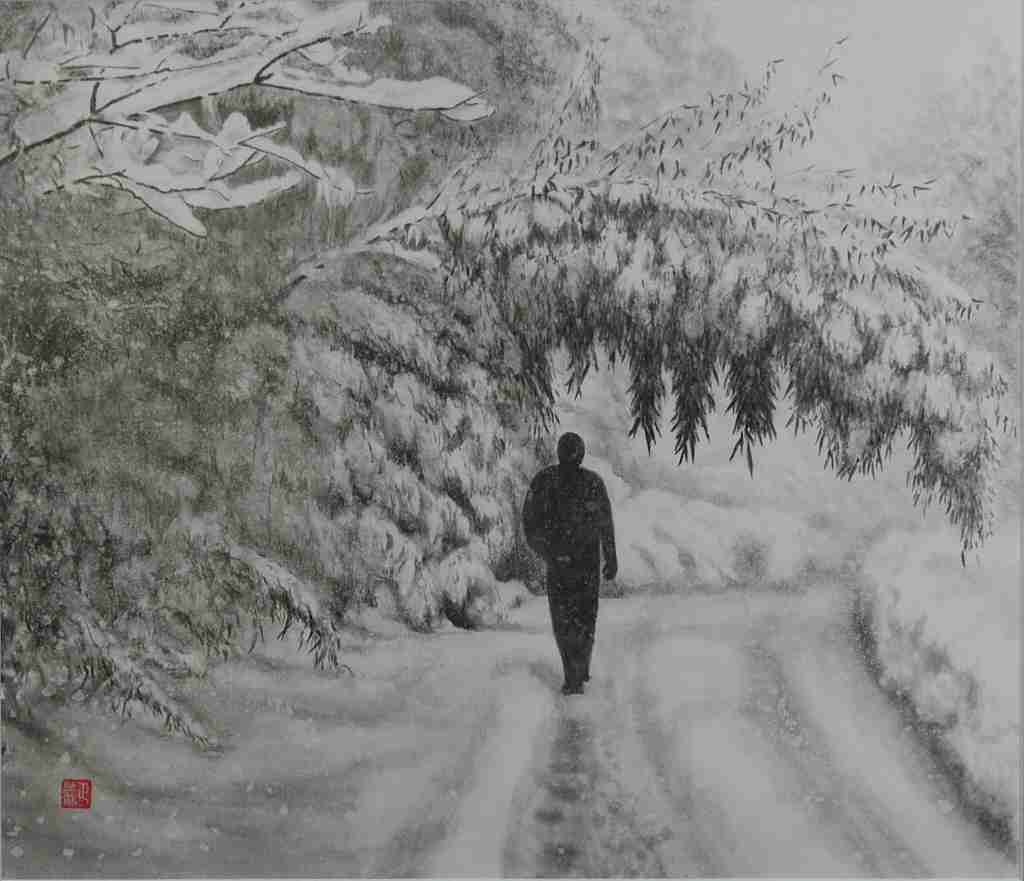 2014年1月の「新春水墨画展」に出展したものですが、ご参考までに「【雪路を往く】」でご確認ください。