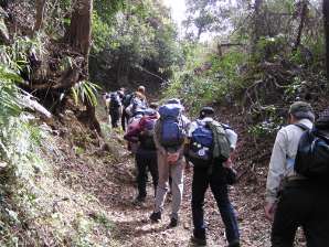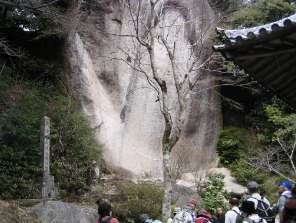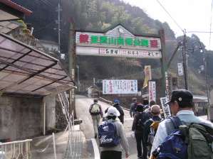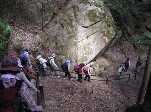 | 松愛会山歩き会で笠置山に行った。今回は低山ながら一気に登るコースだ。 JR笠置駅からしばらく歩くと笠置山への登山口になる。登山口には笠置山自然公園の歓迎アーチがる。左は車道で右が登山道になっている。登山道は崖崩れのため通行止めになっていたが先客組みの後に続いた。この道は数回降りてきたことがあるが登るのははじめてだ。かなりの急な坂が続く。今日の参加者は16名だが初参加の方は少し足元がやばい感じだ。最後についてゆっくり登る。車道とクロスするあたりで崖崩れが起きていたが、応急処置がしてあって特に危険ではない。車道に出たところで休憩を取った。これからまだ急な坂道が続くがゆっくり歩いてもらって笠置寺に到着した。入山料を払って行場めぐりに出かける。 今回は住職さん案内をお願いしたところ、力のこもったすばらしいお話を聞くことができた。笠置寺の縁起、お水取りの話し、磨崖仏のお話、後醍醐天皇、笠置山落城のことなどなど、笠置寺の行場を巡ることによって、未来へ清く生きていく修行ができるなど良いお話を聞くことができた。生き生きし、二の丸あたりで昼食をいただいて貝吹き岩辺りから笠置のすばらしい景色を眺めた。笠置山の山頂の後醍醐天皇の行在所跡を経て行場めぐりを終えた。下山は自動車道を延々と下った。 行場めぐりの後はわかさぎ温泉笠置いこいの館に立ち寄り温泉で汗を流した。つるつるの美人の湯で温まり大広間でビールを頂き大満足の一日になった。 |