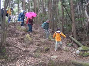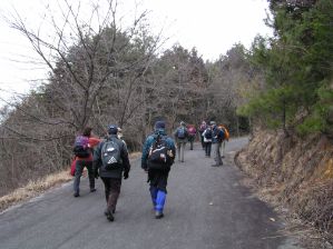 | 松愛会山歩き会主催の例会を行った。今年初めての例会で岩根山に行った。 岩根山は天台宗の行場として十二坊あったことから十二坊という山名もある。甲西駅に降りる。ここは甲西町だったが平成16年に石部町と合併して湖南市になった。湖南市は阿星山と岩根山に挟まれ中央に野洲川が流れる町だ。この地はお伊勢参りの街道、東海道五十三次の宿場が石部にあるなど、街道の町として栄えたそうだ。甲西駅北口から歩き始める。国道1号線を左折し、平松交差点を右折ししばらく行くと野洲川に架かる甲西大橋を渡る。甲西大橋からアンテナの立つ岩根山が正面に見える。美しい眺めの山で天気がよければもっとすばらしいだろう。甲西北中学校を左に見て県道を左折すると、岩瀬神社があり、川沿いに山に入る。榎川に架かった榎橋を渡り、ゲートの袖を通って林道に入る。桜並木などの正福寺林道をゆっくり上がる。林道はゲートで仕切られているため自動車が入ってこないのでゆっくり歩ける。展望が良くなってきたところで水場がある。湖南市街と阿星山系の山々が墨絵のように見える。山頂のアンテナが見え隠れし始めるとまもなく山頂だ。ゲートを過ぎると十二坊林道に出会い右折する。少し上がると左奥に岩の行場のようなところがある。昔の行場なんだろうか。右側に東屋とベンチがあっる。林道を行かず山道に入ると木の展望台に出る。この展望台からの展望はほぼ全展開だ。残念ながら雨模様でモノクロのパノラマしか見ることができなかった。林道を越えて右に山道に入るとアンテナの先に東屋がありここで昼食にした。 雨もほとんど感じられなくなった昼食後、アンテナの建ったピークを超えると岩根山の山頂が現れた。山頂は土盛をしたような赤土の山で山頂に二等三角点が置かれていて、標高は405.1mだ。展望は全展開ですばらしいはずだが今日の天気では少し感激が少ない。山頂とアンテナのあるピークの間に林道が来ていて、東屋、トイレがあり休憩にはいい。 山頂で記念写真の後、6人ほどのパーティーの後を下った。下り道は整備された丸太階段が多い。やがて車道に出ると足元に十二坊温泉の屋根が見える。雨が降り始めたが当初の予定通り磨崖仏に行った。林道を10分ほど下ると右手川の向こうの磨崖仏が見えてくる。雨が降っていたので沢を渡らず眺めた。 磨崖仏と云えば彫りが薄くなっていることが多いがこの磨崖不動明王はとても彫りが深く不動妙らしい。下ってきた林道を引き返し、十二坊温泉ゆららへ行き温泉につかってゆったりくつろいだ。 帰路のバスは逆廻りのため巡回バスで40分ほど回りまわって甲西駅に着いた。着くと同時に電車が発車し、30分寒い中駅で電車を待ち草津から京都へと帰った。 天候が非常に心配されたが少しの雨で余り濡れることもなく、昼食も東屋がありラッキーな山歩きだった。 |