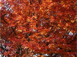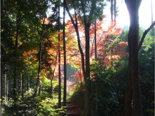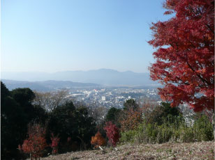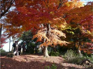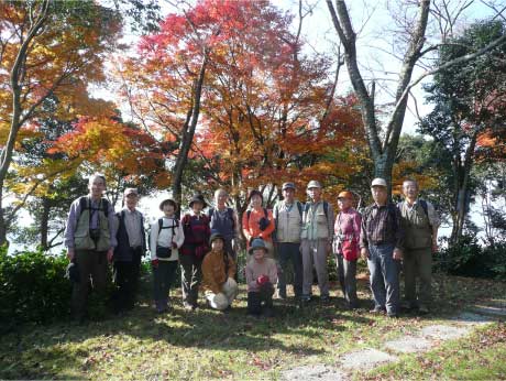 水口岡山城跡の遺構を感じさせられる、名残の石垣を見た後、展望広場に登った。登る途中から美しかった紅葉は展望広場に来るとますます美しく、みんな感動を覚えた。甲賀の展望と紅葉をゆっくり楽しみ予定時間も何のその素晴らしいひと時を過ごした。展望台の南側は広くこの辺りに水口岡山城の天守があったのだろうか。標高は282.9mで四等三角点になっていた。