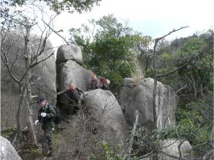 北峰をあとに下山開始、下山は往路ではなく北側から巻いて東に下るコースを取った。北に向かって少し下ると岩場が出てきて、前方に三上山が見えてくる。三上山もふるさと富士で近江富士と呼ばれよく知られた山だ。岩場はチョッとてスリルがあったが全員無事通過。この岩は展望台になっていて三上山の展望が素晴らしい。