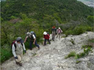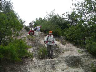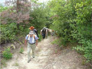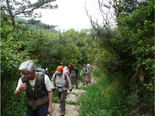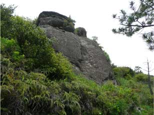 登山口を入ると行けなり岩稜帯の道になる。緩やかの登り道を東側から巻くように登って行く。左上に大きな岩が立ちはだかってくる。修験道の行場で太い鎖が下がっていて、不動明王が祀ってある。登ってみる事にしたが、足場もありびっくりするほどでもない。行として経を唱えながら繰り返し登るのであろう。みんなは行場を登らず巻道を登ってきた。