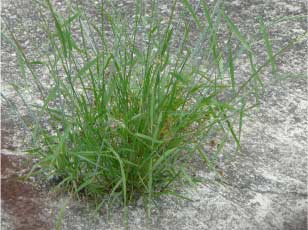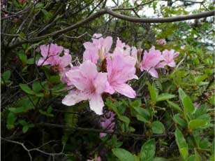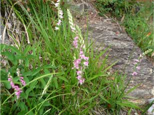 行場から上は、岩稜帯が山頂まで続いている。行場を上がったところに小さな池があり、山頂近くなのに水が湧出でていて、金魚が泳いでいた。池の周りにはネジリグサが花を添えていた。