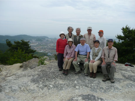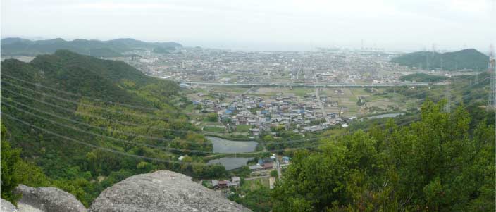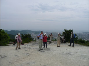 小富士山は、標高173mで低山でありながら素晴らしい展望がえられる。昼食をとっていると、小さいお子さんを連れてお父さんが上がってきた。お子さんは3歳と幼稚園だそうで手軽に登れていい山だ。きっと元気な子の育ってくれるだろう。山頂の大岩から下は絶壁で足元に登山口の神社や池が見える。加古川方向を見れば、高御位山なども見える。隣の仁寿山が背比べをしている。遠く、姫路市街には姫路城が見えて大喜びだ。
