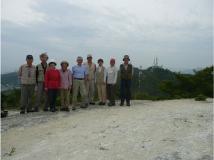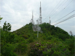 小富士山から見えていた急斜面を登った。振り返ると小富士山がきれいに見えた。ここから見るあんなきつい岩斜面を降りてきたので、みんなでびっくりしていた。山頂はアンテナ群が占領していて、二等三角点もフェンスの中で草に埋まっていた。帰路は車道を巻きながら下った。