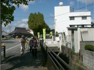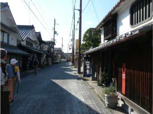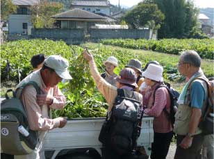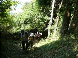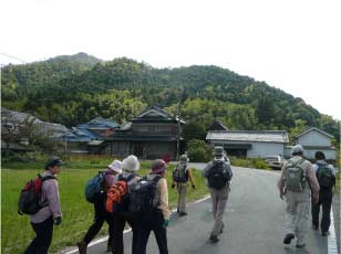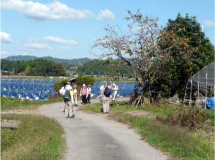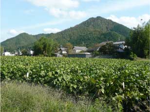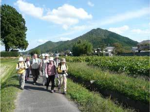 重兵衛茶屋から国道を渡り、田んぼ道を歩いた。田んぼ道から眺める高城山は丹波富士の名の通り美しい。細い田んぼ道の向うから小型トラックが来た。荷台には黒豆の枝豆が一杯積んであった。通り過ぎたかと思ったらお母さんが降りてきて、篠山一の枝豆を作っている。要りようだったら送ってあげるから電話くださいと、美味しい黒豆談義をしてくれた。そのあとおじさんから柿をもらったり道草を楽しんで歩いた。