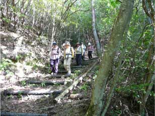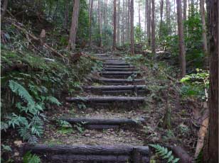主膳屋敷跡を過ぎるといきなり木階段が続く |