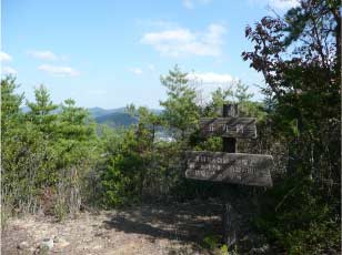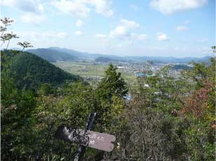 その先に芥丸跡がある。東の山麓の街道防備に当たったところだそうだ。ここからの展望はこの山では一番良い。東の方は木が伸びて少し物足りないが、北の方は三岳から篠山盆地がほぼ展望できる。王地山公園や篠山城も遠望できる。ここのピークは。標高388mぐらいで、山頂にあった基準点のNO.2があった。