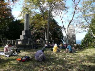 高城山の標高は462mで山頂は、八上城跡本丸でだ。三角点はないが図根の3級基準点NO.1があり、その横に古い石の図根点と思われるものがあった。波多野秀治公表忠碑が建てられていた。展望は木が茂っていてあまり望めないが、三岳方向の眺望が少しある。本丸跡で昼食にした。