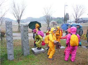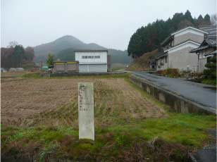 生憎の雨で湿りがちだが小雨なので決行することにした。榛原駅北口から針インター行きのバスに乗る、南之庄東口で降車した。バス停のところがT字路になっていて山に一直線の道がある。その脇に少し消えかかった案内板があった。