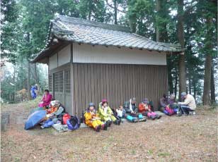 都介野岳は標高631mで四等三角点になっていて、神社がある。今日は展望が期待できないが生駒山まで見えるそうだ。小雨なので神社の軒下をお借りして昼食にした。大した雨にならなくてよかった。