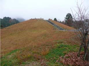 バス停の目と鼻の先に小高い丘が見える。これが三稜墓古墳だ。回り込むように進むと案内板があった。都介野岳から北へ伸びる尾根上に作られた古墳で約直径40m、高さ5m、墳頂部16mの大型円墳だ。墳頂部外周には、円筒埴輪と朝顔形埴輪の埴輪列が特徴だ。古墳時代中期のものだそうで、平成8年に南墳、東墳、そして西墳を合わせて、三稜墓古墳群として奈良県史跡に指定された。