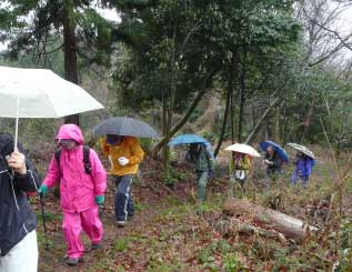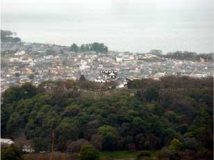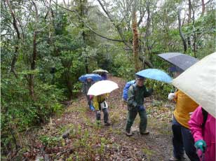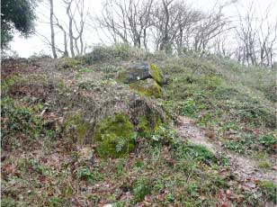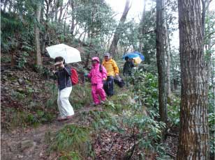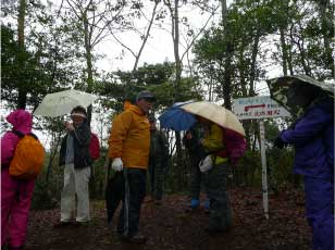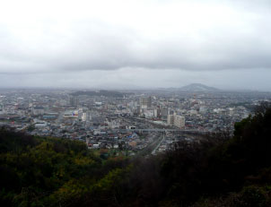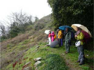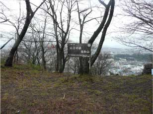 東山ハイキングコースのCコースを行くことにする。今日は、あいにく小雨が降っている。10分ほど緩やかな山道を登ると太鼓丸の案内標があり、さらに数分登ると千貫井戸に着く。千貫井戸は城中の飲料水として用いられた有名な井戸だ。お金の千貫にも換えがたい貴重な井戸ということで千貫井戸と言われた。この辺りは切り開かれていて彦根市街が展望できる。登り始めて30分ほどで山頂の佐和山城跡に到着した。山頂に登りきる手前に本丸の石垣の跡と思われるところがあり往時を偲ばせてくれる。登りついたところが佐和山山頂で三等三角点があり、標高232.5mだ。山頂は広く佐和山城本丸跡の碑が建っていてベンチなどが置かれている。幸いにも雨が止んで昼食に良い按配だ。彦根城と彦根市街を展望できた。伊吹山は雲の中で確認できなかった。
