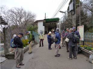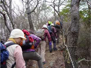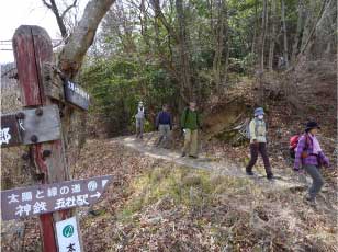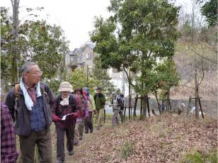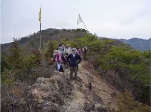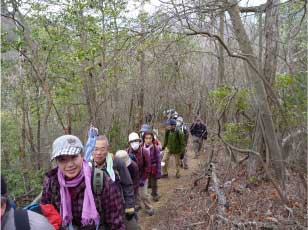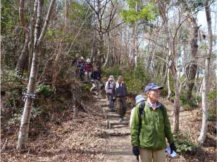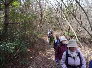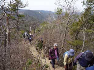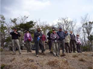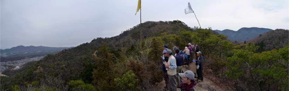 | 3月24日、松愛会山登り会を行った。今年はじめての山登り会で、高丸山に登った。春がもうすぐそこに来ているというのに、寒波がおしよせ進退をくりかえしている。たまたま当日は穏やかな一日だった。 神戸電鉄、五社駅に集合し9時55分に高丸山へ出発した。五社駅から線路沿いに有野台方面へと歩くとバスターミナルになる。ここで準備体操を行って歩き始めた。有野台八丁目山側の児童公園脇の登山口から登りはじめる。 沢沿いの急登から尾根頭への急登となかなか厳しい登りがしばらく続く。できるだけ薄着にしたが汗をするほどだ。約30分頑張ると尾根頭に到着した。展望岩で360度の大パノラマだ。 展望岩は標高約410mで登山口から標高差130mを登ってきた。毎日登山されている会の方が建てたのかあちこちのピークに白や黄色の旗が建っていた。別尾根のパーティーが手を振っていた。双方でエールを送った。 |
