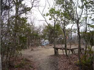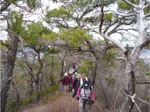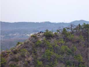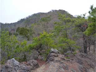 | 展望岩で小休止し、いよいよ高丸山山頂へ尾根道を登った。山頂を前に見ながら進む、尾根道には岩があったり細いところがあったりアップダウンがあったりと変化に富んでいる。約15分ほどで山頂に到着した。 |