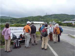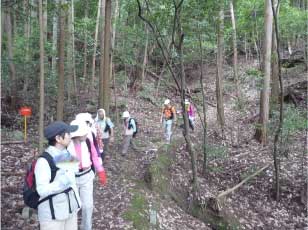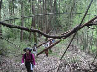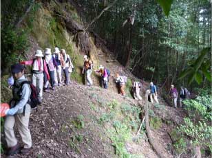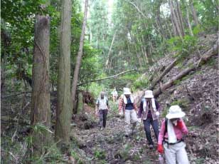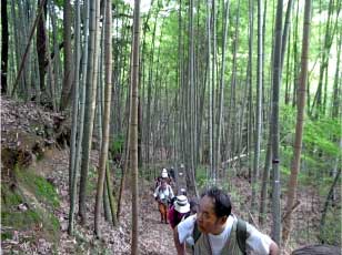 | 7月21日、松愛会山歩き会で三好山に登り下山後、摂津峡でそうめん流しを行った。台風6号が近畿地方に接近、高知と紀伊半島に大雨を降らせ危ぶまれたが、東南方向に逸れていった。 台風一過という天気ではなく前線が停滞したままで曇りで気温も低い一日となった。そんなわけで熱中症が心配されてどうしようか悩みだったが幸か不幸か心配は無用になった。 JR高槻駅を8時35分高槻市バスで塚脇へ。バス停から妙力寺の道案内に沿って山に向かって登って行く。道なりに進むと高槻黄金の里があり、しばらく行くと右手に山道があり三好山まで40分の案内板がある。 比較的広い道を登っていくと、雑草が道を覆いはじめるるが我慢しながら前進する。左側に小さな池があり、井戸や土塁や石垣の跡と思われる城の中央の鞍部に着く。三好山へ25分の標識がある。ここから左に進み、竹薮の中を主郭へと登って行く。棚田のようになったところには城郭の建屋があったのだろう。二ノ丸、三ノ丸と思われるところを過ぎると本丸であろう主郭の山頂に着く。 三好山は、芥川山城(あくたがわさんじょう)で、摂津峡東岸にそびえる山に築かれた戦国時代屈指の城郭だったそうだ。三好長慶(ながよし/ちょうけい)が1553年入城したとされる。三好長慶は、徳島県三好市生まれで戦国時代の武将で畿内阿波の戦国大名、室町幕府の摂津守護代。 上の口側に井戸まで戻り下る。道はぬかるんでいて薄暗い、左下に摂津峡の芥川が見えてきて一安心だ。ガケ崩れなど整備されていない道を下ると民家手前に出る。ここから草むらをかき分けてやっと広い通りに出た。反対側から登るとすれば道はわからないだろう。 上の口バス停へ歩き、ここから安岡寺住宅バス停までさらに下る。ここのスーパーで食材を調達して、塚脇から摂津峡さくら広場まで歩く。 |