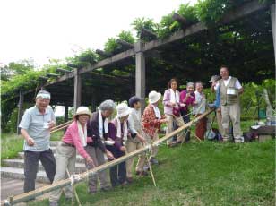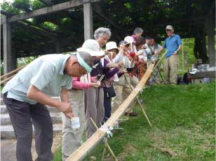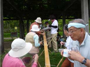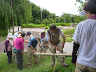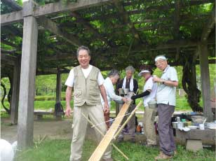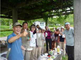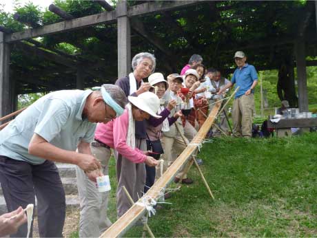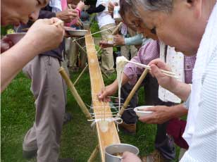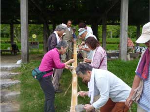 | 摂津峡さくら広場に到着。早速そうめん流しの準備にかかる。そうめんを大量に湯掻いたり、薬味を作ったり食べる準備をする一方、そうめんを流す竹樋(たけとい)の設置に忙しい。 そうめんの試験流しも出来たところで乾杯にした。そしてそうめん流し本番、竹樋に並んで流れを待ってすくい上げる。美味しい美味しいと竹樋に箸をさしていた。 この日のために竹樋を製作してくれた会員の I氏の苦労に感謝したい。実にうまく作られていて全長約6mの竹樋が完成したのだ。竹を切り出せる場所から遠くはなれたところで使用するので造り方から持ち運びといろんな制限を克服してのできだった。 参加者全員大いに喜び楽しみながら美味しいそうめんを味わった。竹樋を作っていただいた方、ここまで運んで頂いた方、調理道具を運んで頂いた方、食材を運んで頂いたり、食材の下ごしらえをして頂いた方等々ありがとうございました。全員の創意と協力で楽しかったそうめん流しが出来たと思います。皆さんありがとうございました。 三好山に登って汗をし、そうめん流しで納涼を楽しみ、花の里温泉祥風苑で温泉につかりくつろぎ、高槻駅まで戻って反省会と今日一日楽しく過ごせた。感謝感謝です。ありがとうございました。 |
