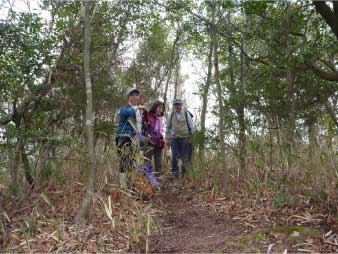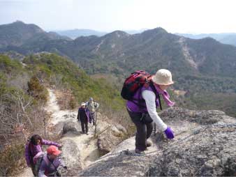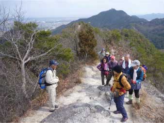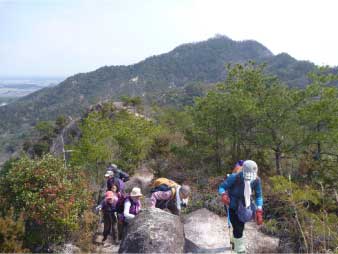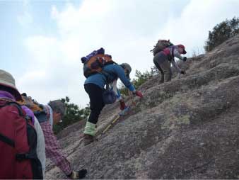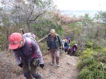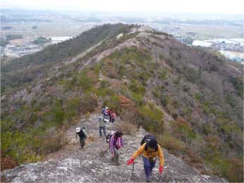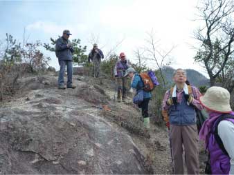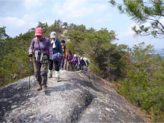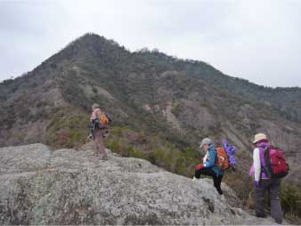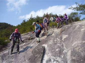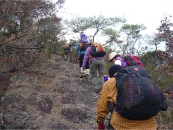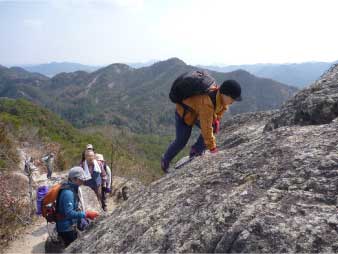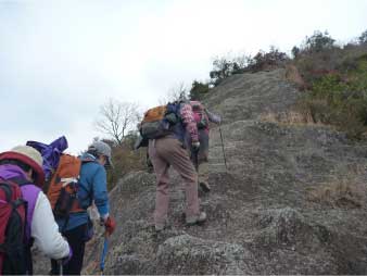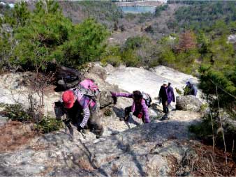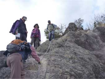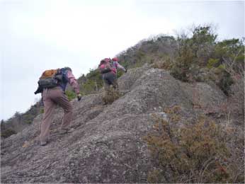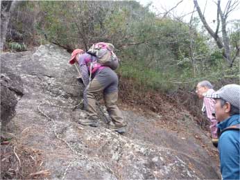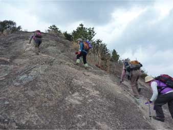 | このピークで小休止をとりながら展望を楽しんだ後、尾根の露岩の上を歩いてしばらく進む。やがて露岩の登りも標高150mから急登になってくる。標高約230mまで標高差80mは、アルプスに負けないくらいの岩登りが続く。 | ||||||||||||