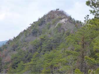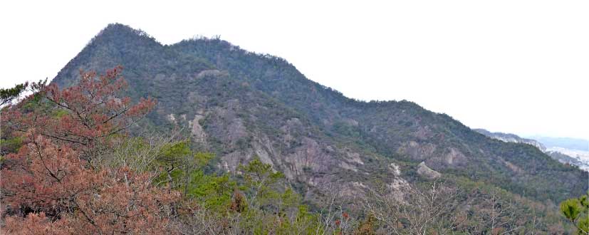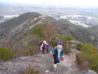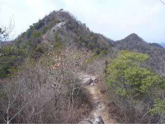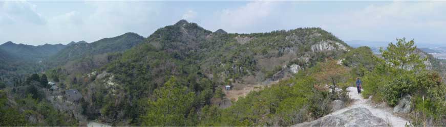 | 細い脇道をほんの少し行くと、竹薮になりさらに細い道になる。7、8分歩くと竹薮もなくなり雑木林の登り道になり、下里小からの道と合流する。さっそく露岩の道になり急登になってくる。低山なのに登り初めから岩の道の急登になるので、低山とは思えない感じが登り初めから伝わってくる。 少し汗をしはじめたところで尾根頭のピークに到着。このピークは標高約140mで展望が素晴らしい。正面に善防山の第二ピークの円錐形が美しく見え中央に山頂が見える。登って来た方を振り返ると、播磨平野が広がり溜池の多いのに目を引かれる。 |