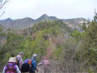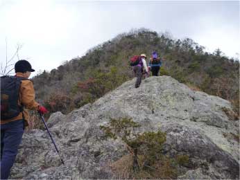 | 昼食と展望を楽しんで笠松山山頂へと続く岩の尾根道を歩いた。しばらく尾根を行くと正面に標高差約30mの岩の急斜面を登りきって尾根を少し行くと、お寺から山頂に続く尾根に合流する。 | ||||||||||||