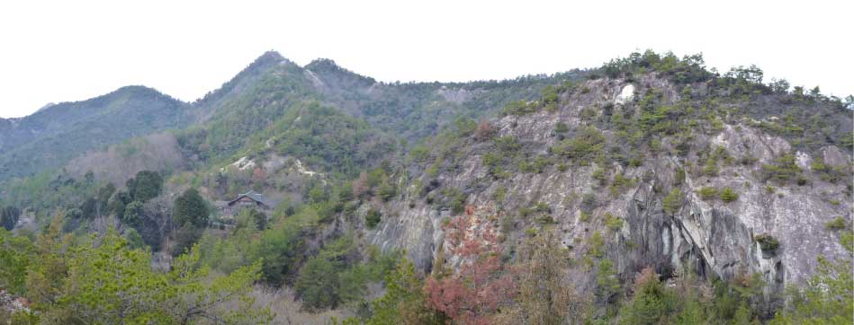 | 一枚岩のような大きな岩壁を登りきると、笠松山や石の砕石場などがパノラマのように見える。笠松山の麓には古法華寺(ふるほっけじ・ふるほっけでら)、手前のピークに磨崖仏だろうか岩に彫られている。 右の岩尾根沿いに進み笠松山へ行くことにした。善防山の登り始め空模様があまりよくなかったので、山頂では晴れていたが予定していた昼食を先に進んで吊橋近くでと考えて下ってきた。 |
